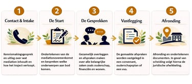 - Worden praktische zaken besproken, zoals de werkwijze, kosten en mediationovereenkomst.